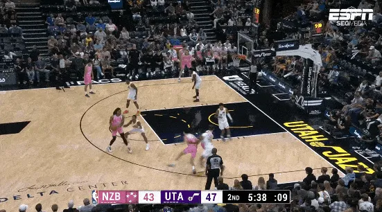 在进攻端,卡里姆-洛佩兹的角色是从简单的easy ball开始的。他在转换进攻方面可以很好地展现自身的运动能力。他在场上的体格有点让人想起温斯洛,依靠优秀的跑跳和对抗,2米身高的洛佩兹可以作为快下的第一线冲击篮下完成终结。接近220磅的体重和宽厚的肩膀已经达到了NBA水准,且手掌较大,具备不错的臂展。而这也让他的进攻篮板变得非常出色,靠着力量和弹跳,他甚至可以在对抗激烈的澳洲场均拿到1.4进攻篮板,在对手头上摘下篮板后强硬补篮。